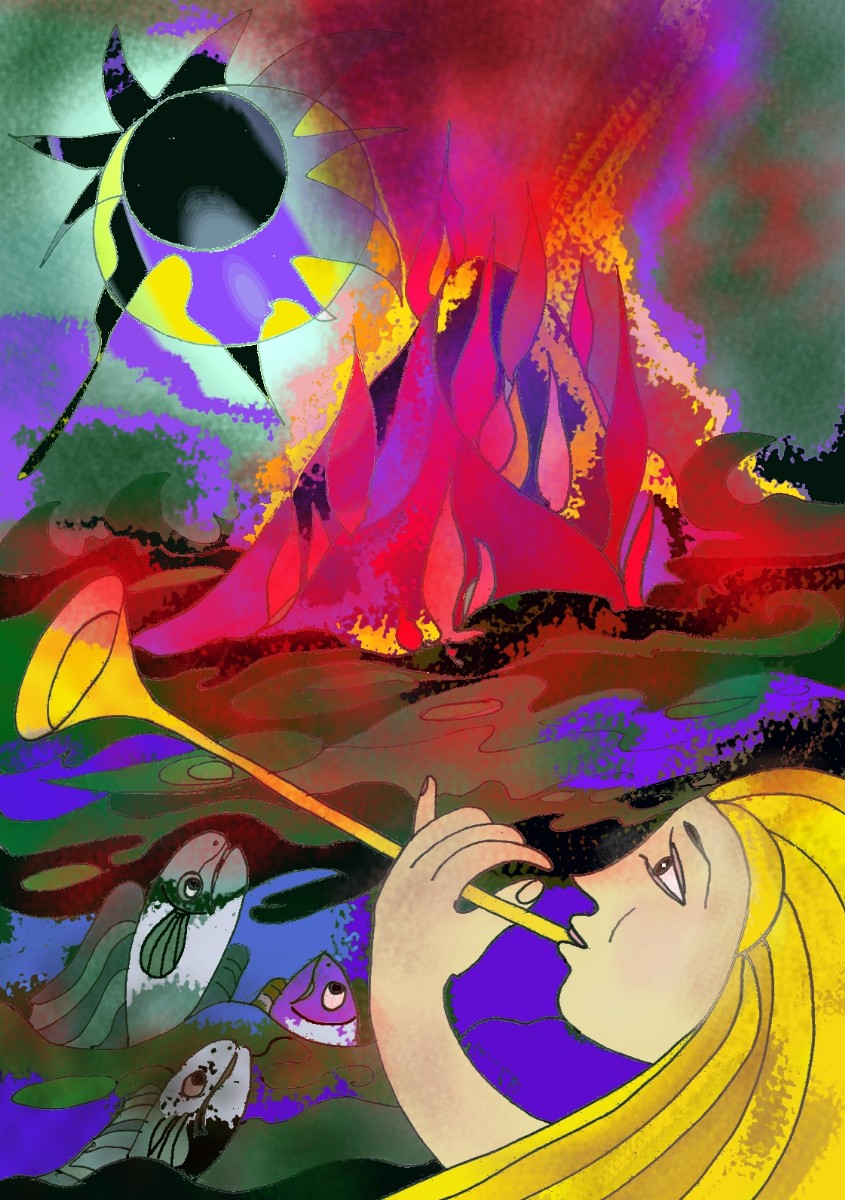 comme une grande montagne embrasée par le feu fut jeté dans la mer;