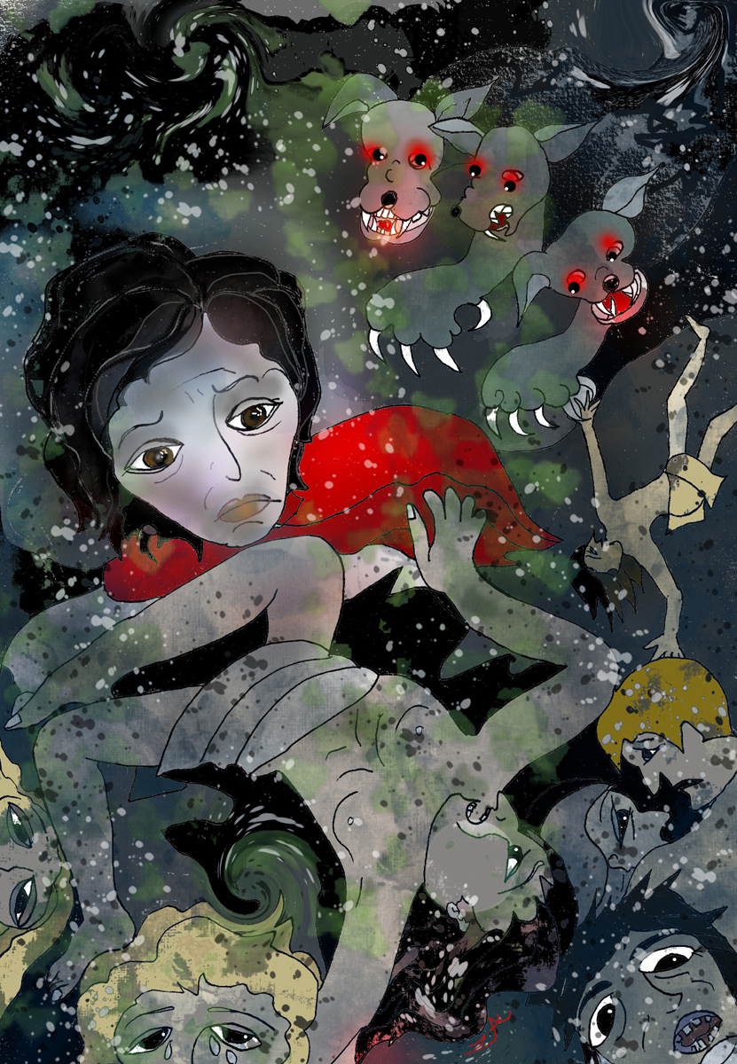 Je suis au troisième cercle de la pluie éternelle, maudite, froide, pesante: toujours la même, toujours elle tombe également. Des averses de forte grêle, et d'eau noire, et de neige, traversent l'air ténébreux; fétide est la terre qui les reçoit. Cerbère, bête cruelle et de forme monstrueuse, avec trois gueules aboie contre ceux qui sont là submergés. Il a les yeux rouges, la barbe grasse et noire, le ventre large, les mains armées de griffes: il déchire les esprits, les écorche, et les dépèce. La pluie les fait hurler comme des chiens: fréquemment les malheureux profanes se tournent faisant d'un de leurs côtés un abri à l'autre.
