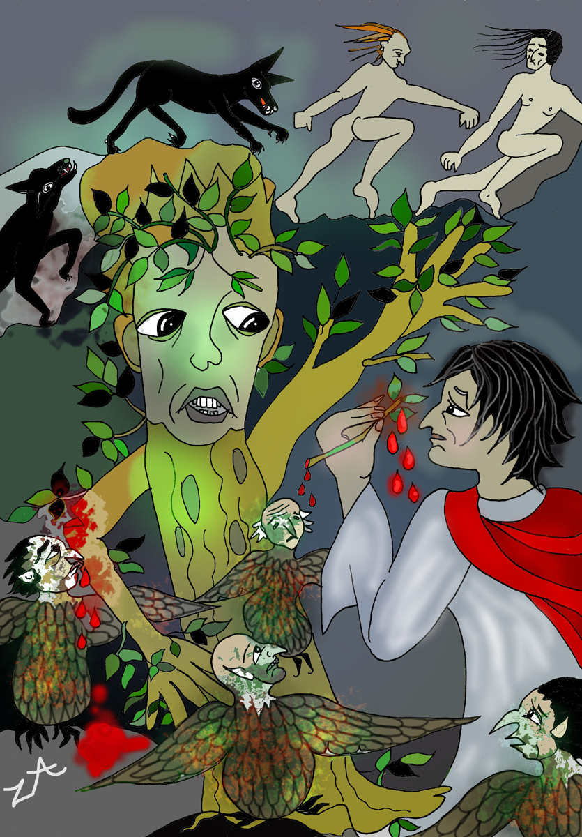VIRGILE ET DANTE TRAVERSENT LA DEUXIÈME PARTIE DU SEPTIÈME CERCLE DE LA VIOLENCE: CELLE FAITE À EUX MÊMES PAR LES SUICIDÉS, OMBRES DEVENUES ARBRES, DONT LES DÉPOUILLES HUMAINES DEMEURERONT, À LA FIN DES TEMPS, ACCROCHÉES À LEURS BRANCHES.