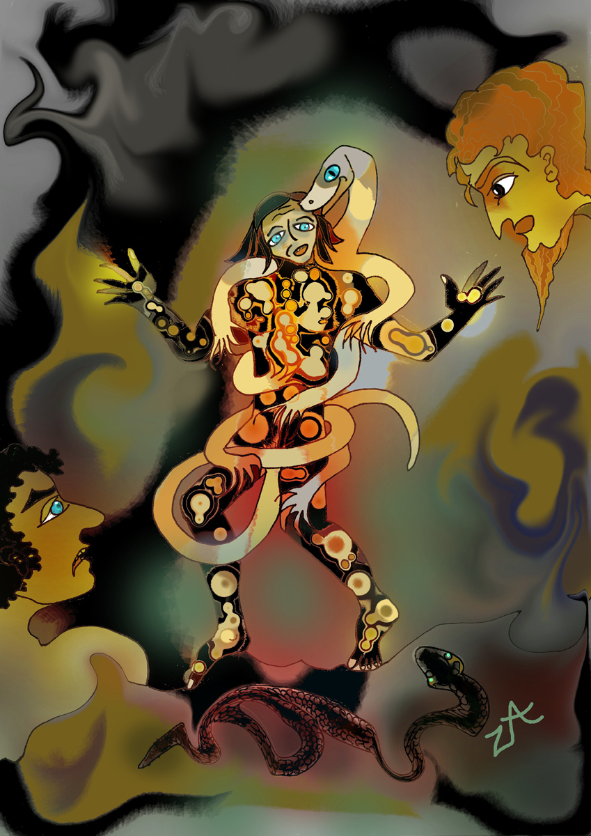DANS LA MÊME BOLGE, LES ÂMES DES VOLEURS* SE MÉTAMORPHOSENT EN SERPENTS. DANTE VOIT L'UN D'EUX, AGNEL, FUSIONNER AVEC CIANFA DEVENU SERPENT À SIX PATTES.