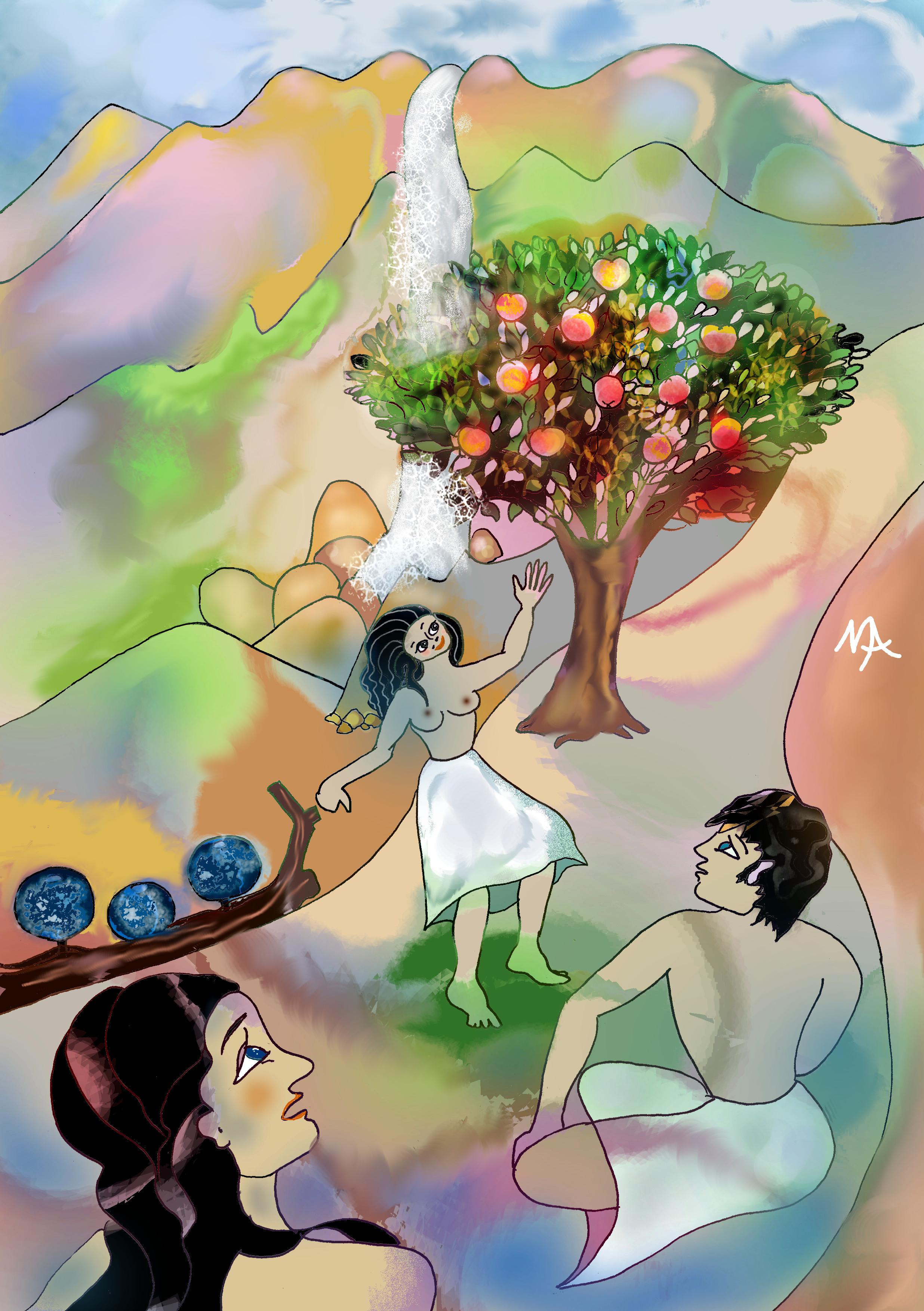 Mais tôt rompit le doux discourir, un arbre qu'au milieu du sentier nous trouvâmes, chargé de pommes, à l'odorat suaves et bonnes. Et comme le sapin,de rameau en rameau, se rétrécit en s'élevant, ainsi cet arbre en descendant, afin, je crois, que dessus nul ne monte. Du côté où le chemin était fermé, tombait du roc élevé une eau claire, qui se répandait d'en haut sur les feuilles. Les deux Poètes s'approchèrent de l'arbre, et d'au dedans, à travers le feuillage, une voix cria; «De ce fruit vous aurez disette». Puis elle dit; «Plus pensait Marie à ce que les noces fussent honorables et complètes, qu'à sa bouche, qui maintenant pour vous répond. Et les antiques Romains se contentèrent d'eau pour boisson, et Daniel méprisa le manger, et acquit le savoir. Le premier âge fut beau comme l'or; il rendit par la faim les glands savoureux, et par la soif fit, de chaque ruisseau du nectar. Du miel et des sauterelles furent la nourriture de Baptiste dans le désert; pour cela glorieux est-il, et aussi grand que le déclare l'évangile».