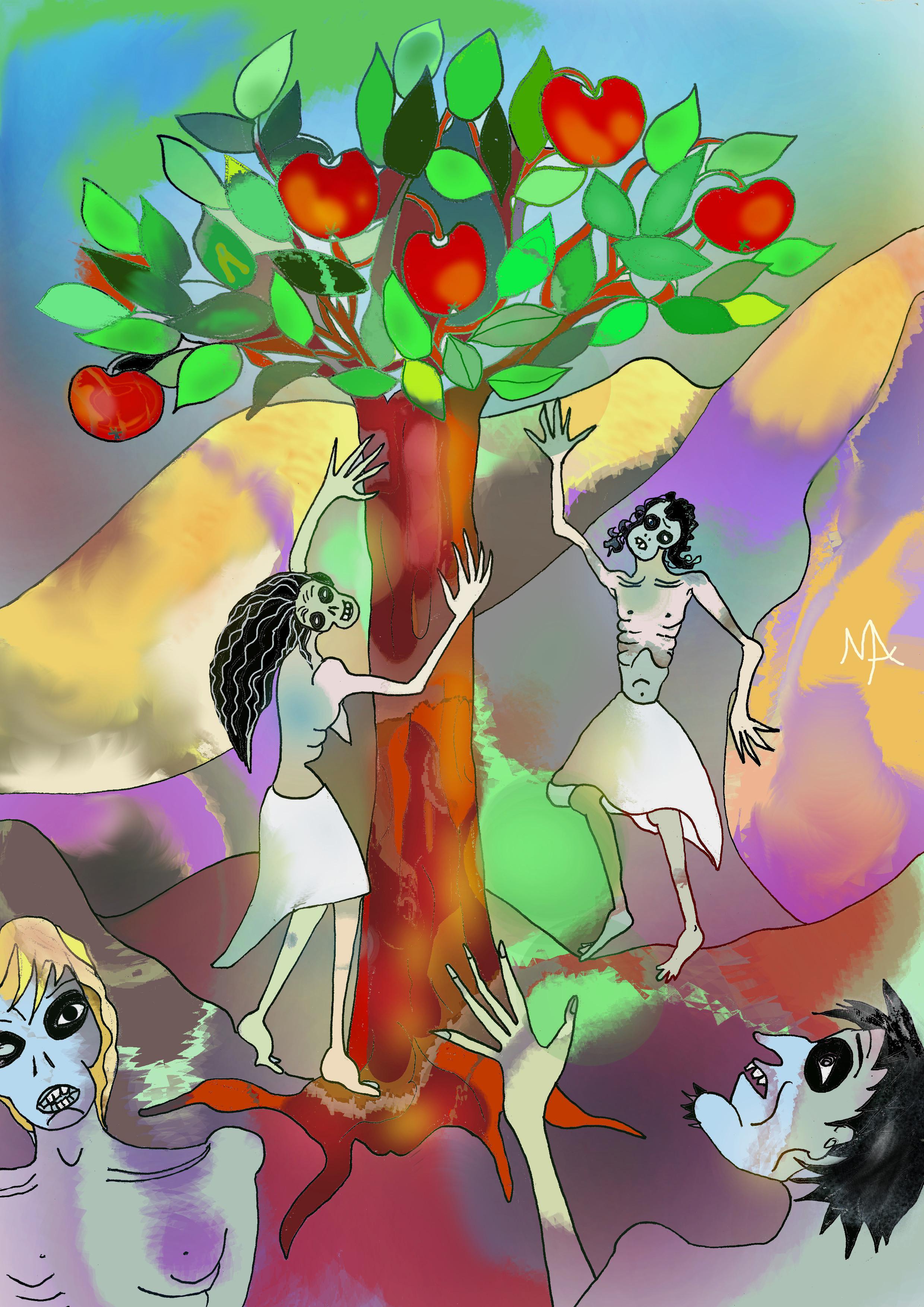 «Passez outre, sans vous approcher! plus haut est l'arbre que mordit Eve, et ce plant en a été tiré». Ainsi, entre les branches, disait je ne sais qui; par quoi arrêtés, Virgile et Stace et moi, nous prîmes du côté qui s'élève.